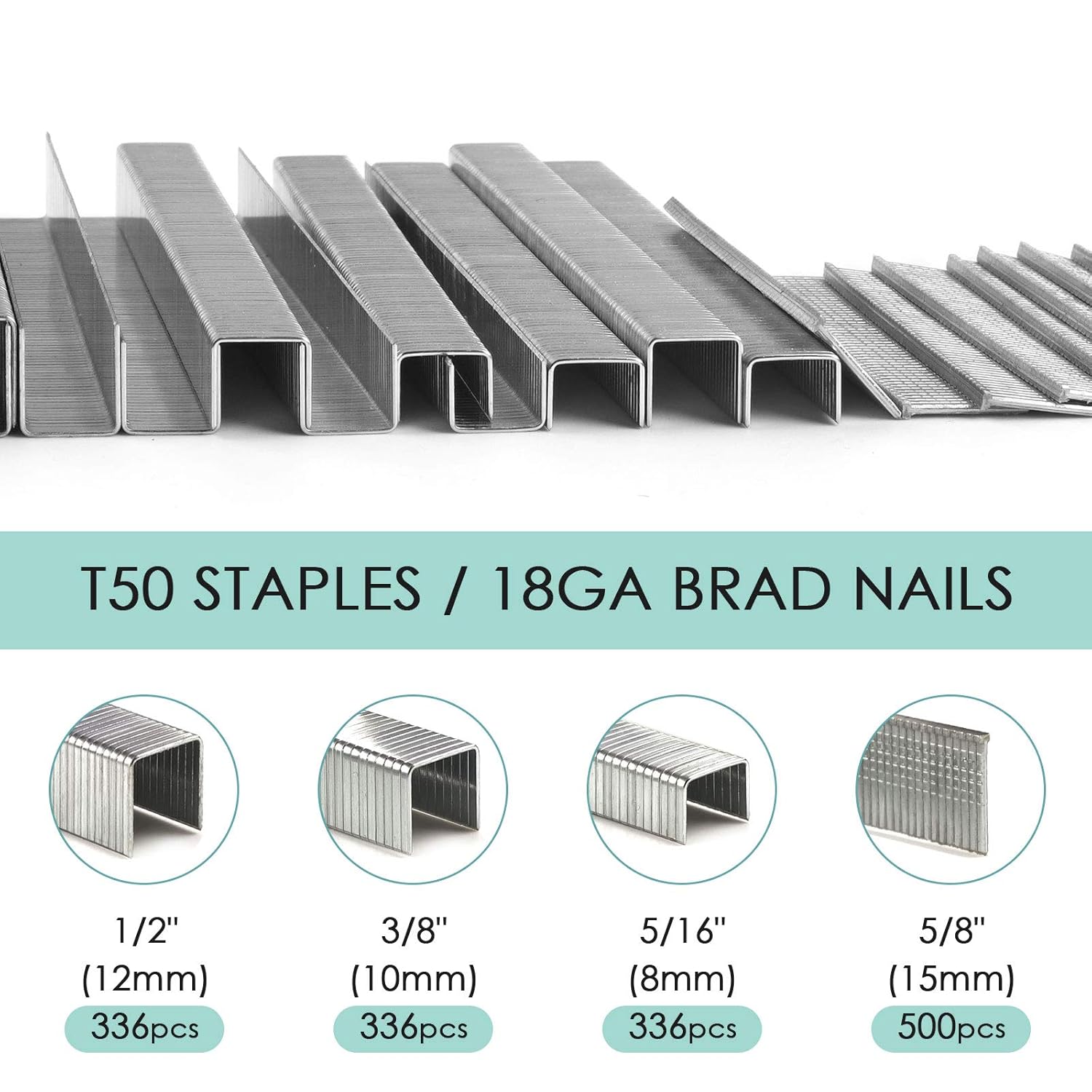 - [What You Get ] --- 1508-count heavy duty Fasteners in 4 different sizes. Includes: T50 1/2" Staple*336pcs, T50 3/8" Staple*336pcs, T50 5/16” Staple*336pcs & 18 Gauge Brad Nail 5/8" *500pcs, which will meet most of your fastening needs.